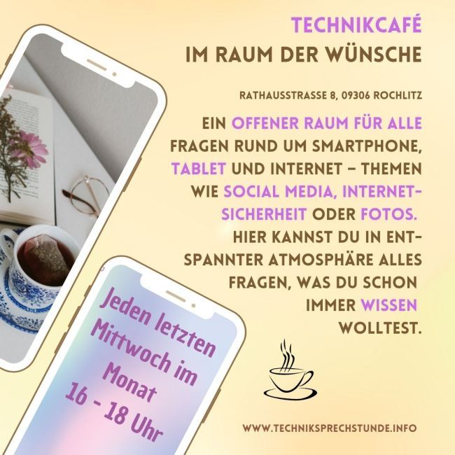Wir bieten im Raum der Wünsche in Rochlitz einen offenen Raum für alle Fragen rund um Smartphone, Tablet und Internet – Themen wie Social Media, Internet-sicherheit oder Fotos und vieles mehr - hier kannst du in entspannter Atmosphäre alles fragen, was du schon immer wissen wolltest.