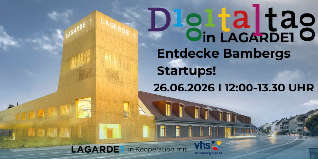 Anlässlich dieser Aktion öffnet das Digitale Gründerzentrum LAGARDE1 in Kooperation mit der VHS Bamberg Stadt seine Tore und gibt Einblicke in die Welt der digitalen Startups. Während einer Führung durch das Gründerzentrum stellen sich Startups vor und kommen mit den Teilnehmenden in den Austausch.